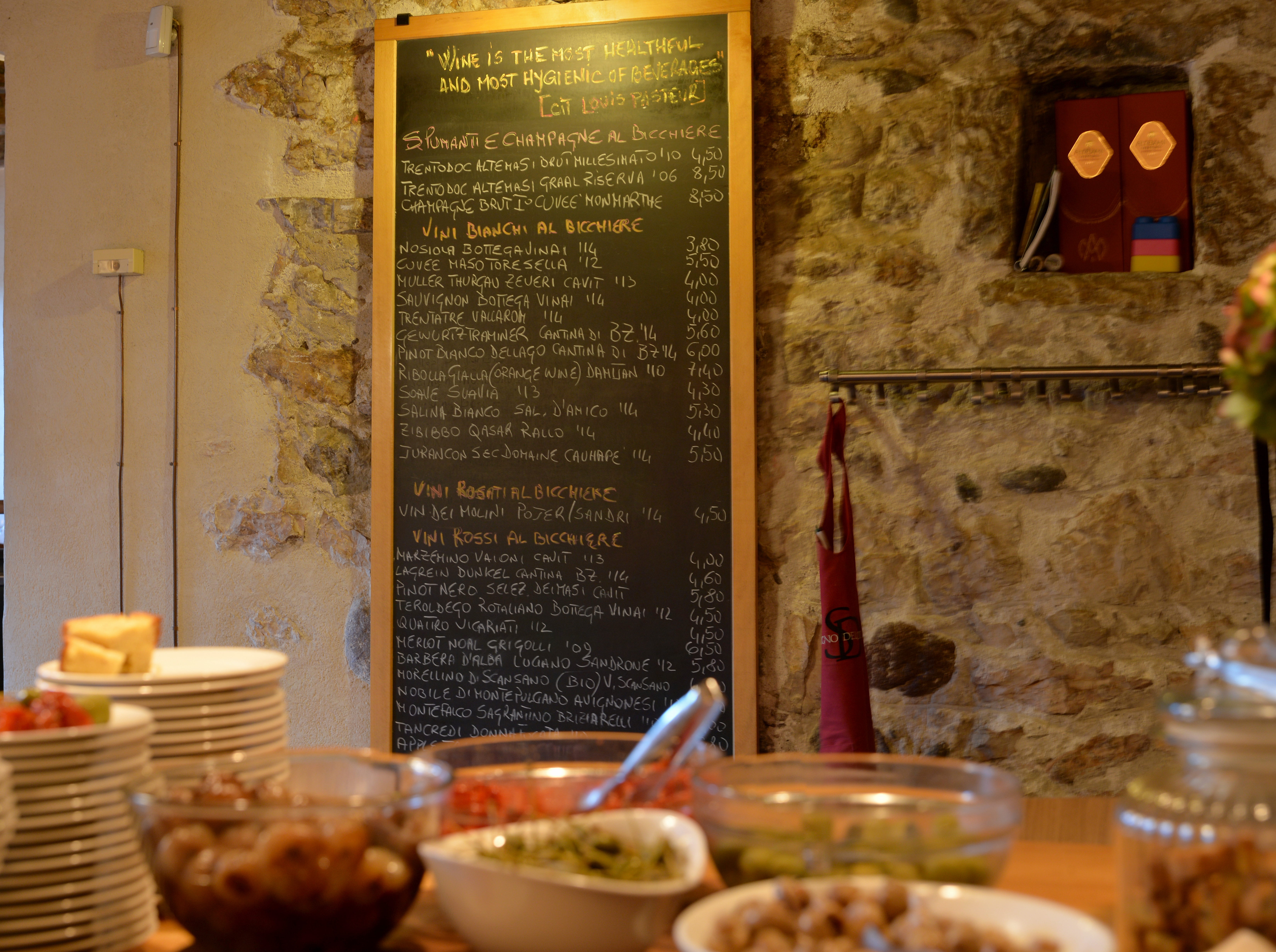 La lista dei vini in degustazione a bicchiere è però vastissima: dai più ricercati ai più costosi, sia italiani che stranieri. La degustazione può avvenire quindi sia al banco, sia seduti comodamente al tavolo, sempre sotto il consiglio e le interessanti spiegazioni dello Staff.