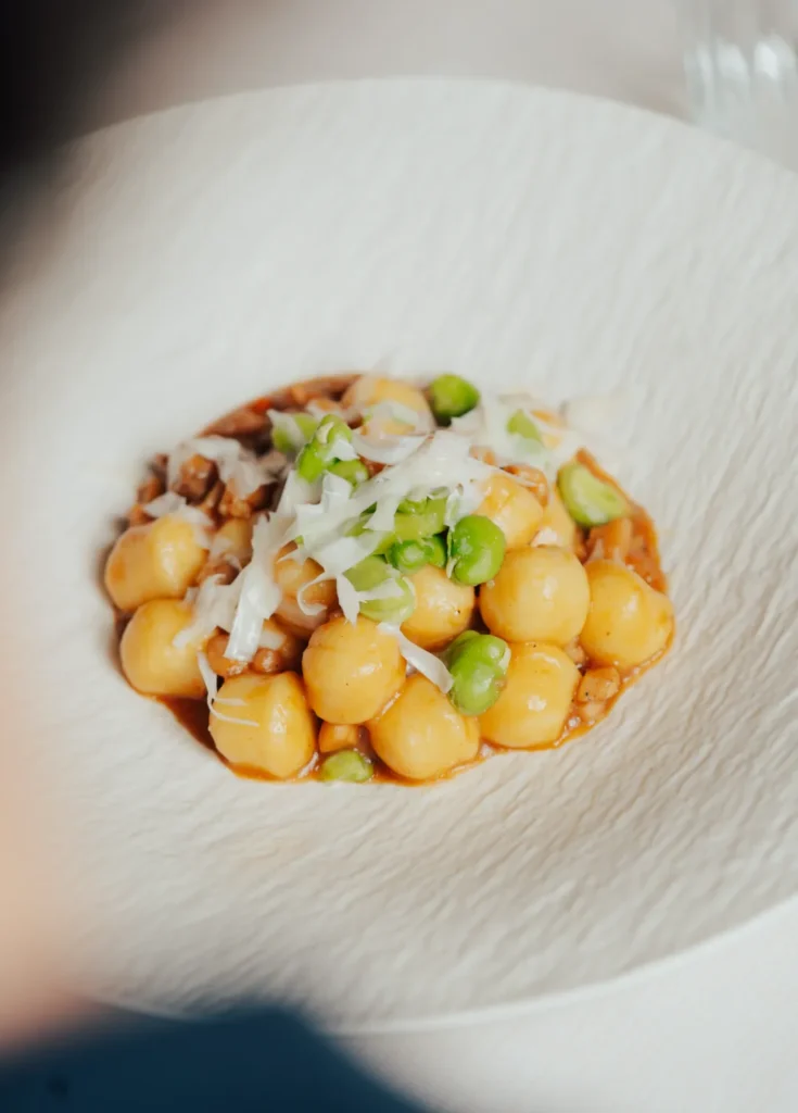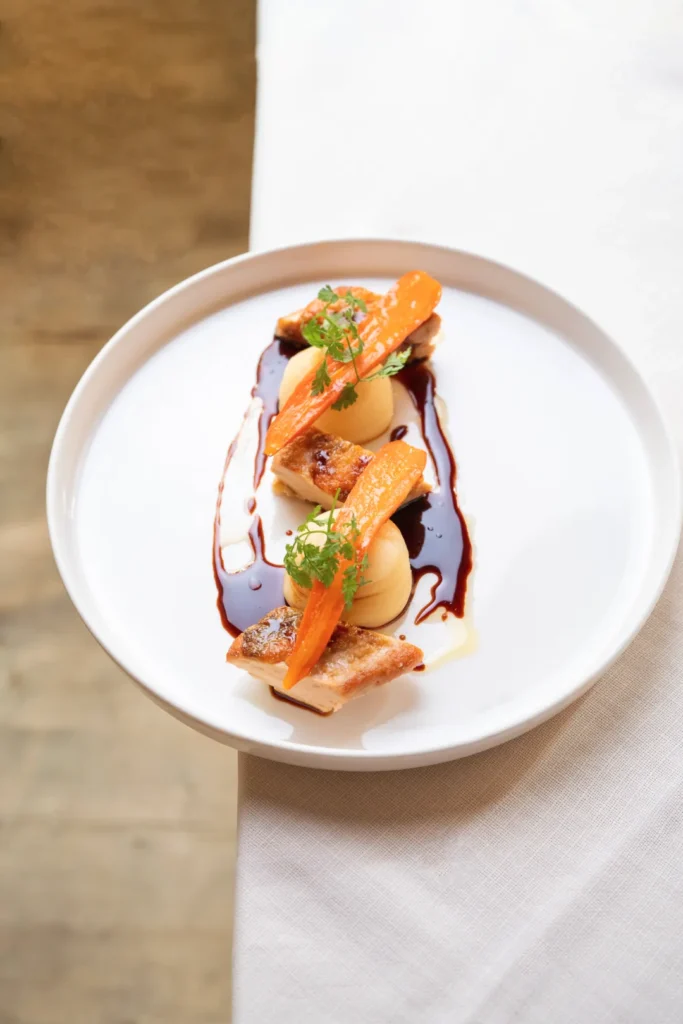 Guancetta di vitellina con crema di piselli e carote arrostite “km 0”