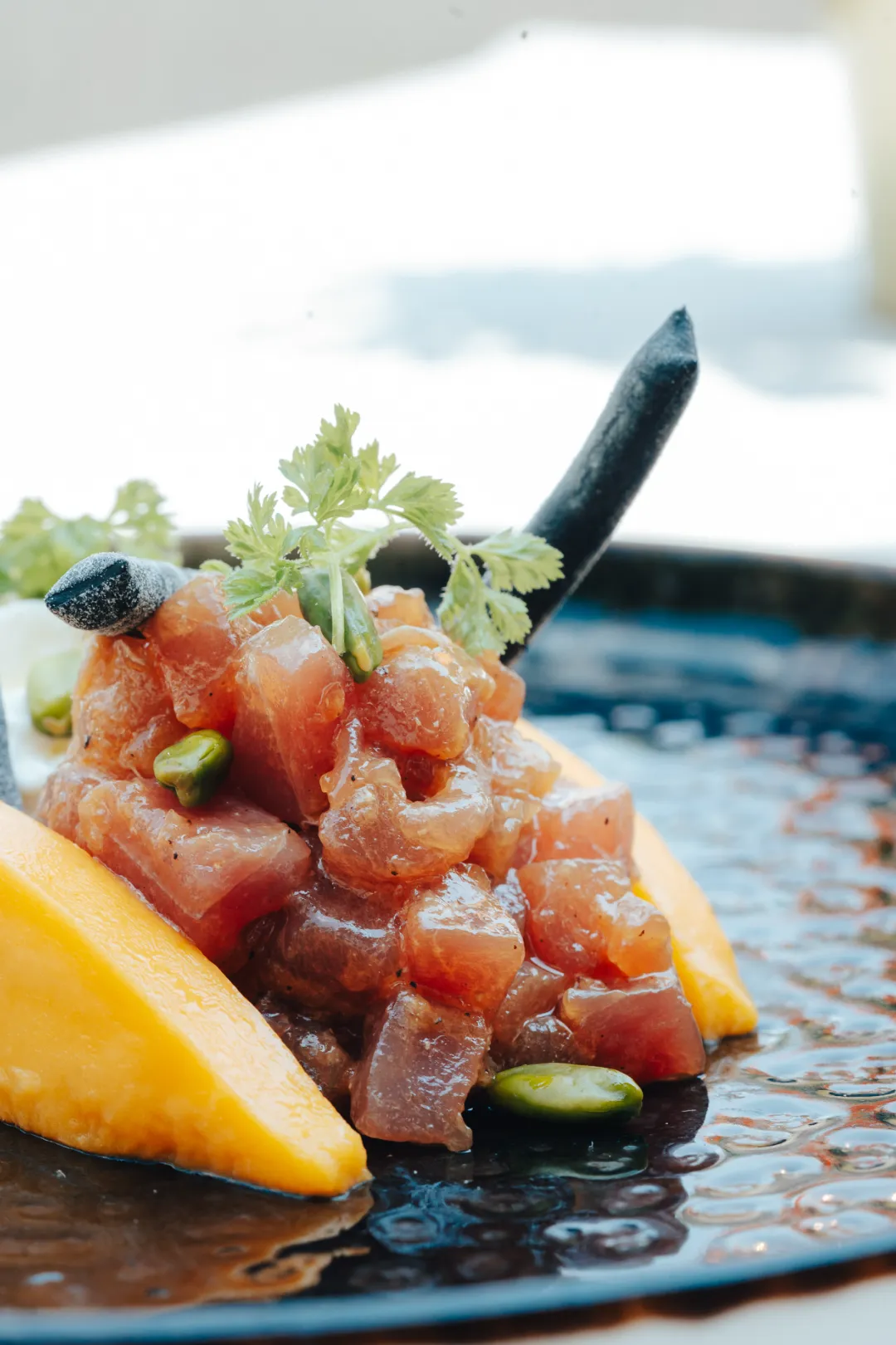 Carpaccio di pesce spada° affumicato con mousse di carote, insalata riccia, frutta esotica, pistacchi, zenzero e grissino al mais