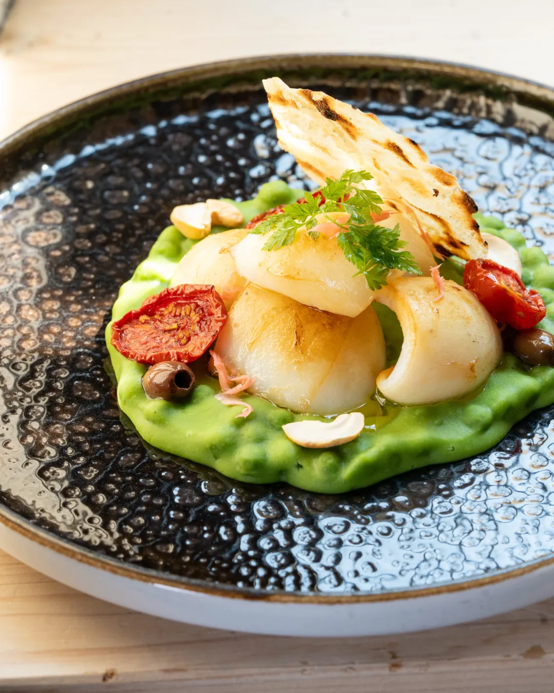 Baccalà mantecato con crema di ceci, peperone crusco e crostini di pane alle olive